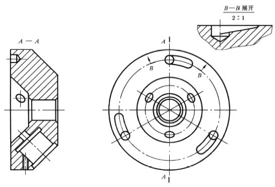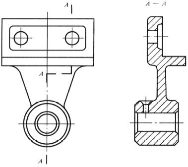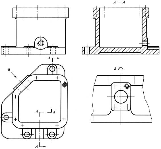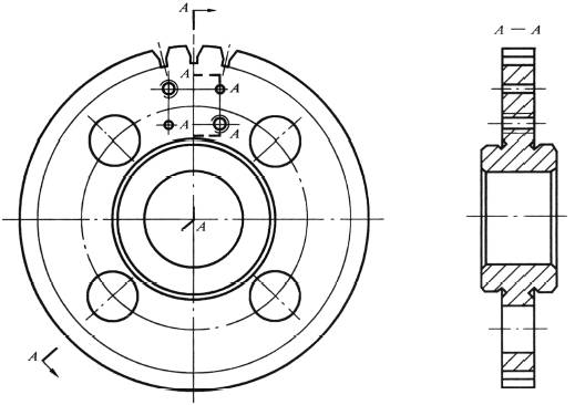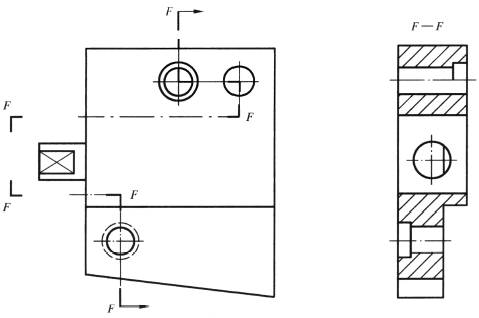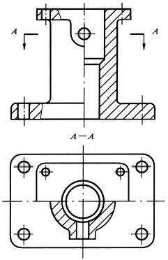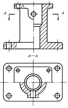 一般应在剖视图的上方用大写的拉丁字母标出剖视图的名称“×—×”。在相应的视图上用剖切符号表示剖切位置和投射方向(用箭头表示),并标注相同的字母,见图a、图b、图c、图d。剖切符号之间的剖切线可省略不画 |