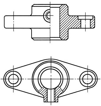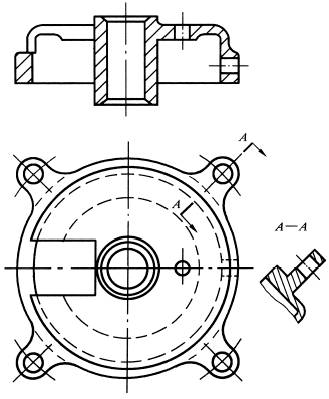 当单一剖切平面的剖切位置明确时,局部剖视图不必标注,见图a:主视图上的两上小孔、图b:俯视图 |