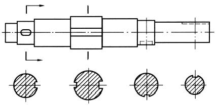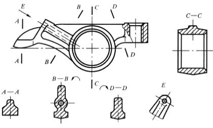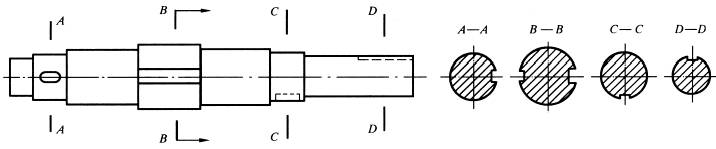配置在剖切符号延长线上的不对称移出断面不必标注字母,见图a。不配置在剖切符号延长线上的对称移出断面(图b:A—A、图c:C—C和D—D),以及按投影关系配置的移出断面(图d和图e),一般不必标注箭头。配置在剖切线延长线上的对称移出断面,不必标注字母和箭头,见图f及图g右边的两个断面图 |