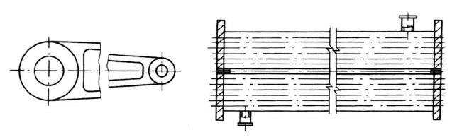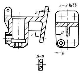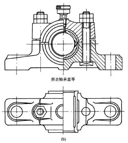 在装配图中,可假想沿某些零件的结合面剖切(图a,B—B),或假想将某些零件拆卸后绘制,需要说明时可加注“拆去××等”(图b)。这种表示法,允许在装配图中将一些标准件或简单零件等拆卸去,将需要表示重要零件详细绘出,既表达了装配关系,又突出了重点 |