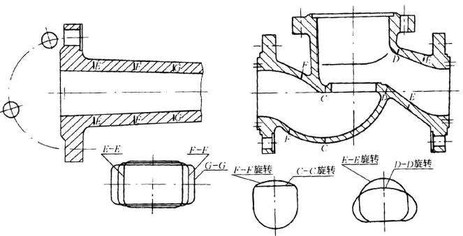 用一系列剖面表示机件上较复杂的曲面时,可只画出剖面轮廓,并可配置在同一个位置上 |