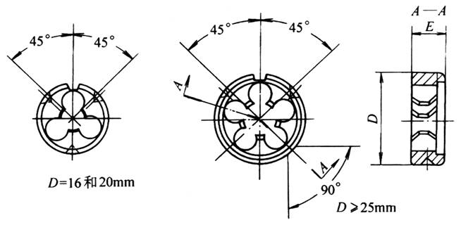 注:1.容屑孔数不作规定。 2.圆板牙两端的切削锥由制造厂根据使用要求自行规定,但至少有一端切削锥长度应符合螺纹收尾(GB/T3)规定。 |
