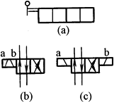 双向控制的控制机构符号,原则上只需绘制一个,如图a 在双作用电磁铁控制符号中,当必须表示电信号和阀位置关系时,不采用双作用电磁铁符号(图b),而采用两个单作用电磁铁符号(图c) |
