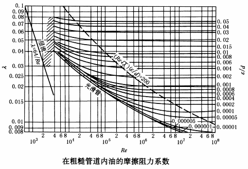 υ —— 管内平均流速,m/s d —— 圆管内径,m v —— 流体的运动粘度,m2/s Re(L) —— 临界雷诺数:圆形光滑管,Re(L)=2000~2300;橡胶管,Re(L)=1600~2000 λ —— 沿程阻力系数,它是Re和相对粗糙度 表圆管的沿程阻力系数λ的计算公式的公式计算或从下图的摩迪图中直接查得。管壁的绝对粗糙度ε见表各种新管内壁绝对粗糙度ε l —— 圆管的长度,m ρ —— 流体的密度,kg/m3 ξ —— 局部阻力系数,各种情况的局部阻力系数见表管道入口处的局部阻力系数、表管道出口处的局部阻力系数、表管道扩大处的局部阻力系数、表管道缩小处的局部阻力系数、表弯管的局部阻力系数、表分支管的局部阻力系数、表交贯钻孔通道的局部阻力系数、表阀口的局部阻力系数 |