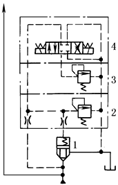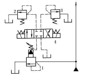 用三个溢流阀进行遥控连接,使系统有三种不同压力调定值。主溢流阀1的遥控口接入一个三位四通换向阀4,操纵换向阀使其处于不同工作位置,可使液压系统得到不同的压力 |