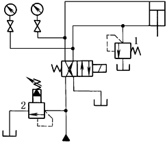 本回路由插装阀1、带有先导调压阀的控制盖板2、可叠加的调压阀3和三位四通阀4组成,具有高低压选择和卸荷控制功能。插装阀组成的调压回路适用于大流量的液压系统 |