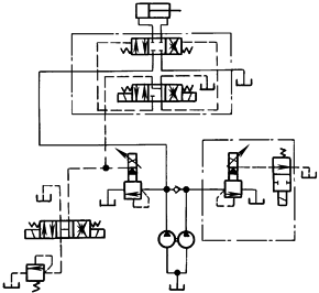 采用复合泵调压回路时,泵的容量必须与工作要求相适应,并减少在低速驱动时因流量过大而产生无用的热。本回路采用电气控制,能按要求以不同的压力和流量工作,保持较高的效率,具有压力补偿变量泵所具有的优点。回油路中电液动换向阀的操纵油路从溢流阀的遥控口引出,避免了主换向阀切换时所引起的冲击 |