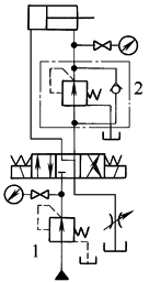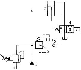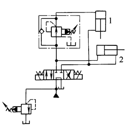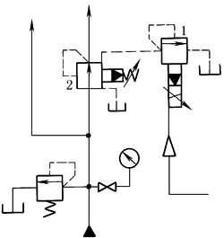 用比例先导压力阀1接在减压阀2的遥控口上,使分支油路实现连续无级减压。该回路只需采用小规格的比例先导压力阀即可实现遥控无级减压 |