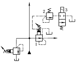 在先导式减压阀1遥控油路上接入远程调压阀2使减压回路获得两种预定的压力。图示位置,减压阀出口压力由该阀本身调定;当二位二通阀3切换后,减压阀出口压力改为由阀2调定的另一个较低的压力值。阀3接在阀2之后,可以使压力转换时冲击小些 |