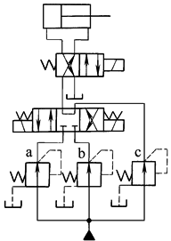 本回路用减压阀并联,由三位四通换向阀进行转换,可使液压缸得到不同的压力。图示位置时,供油经阀c减压;三位阀切换到左位时,供油由阀a减压;三位阀切换到右位,供油由阀b减压 |