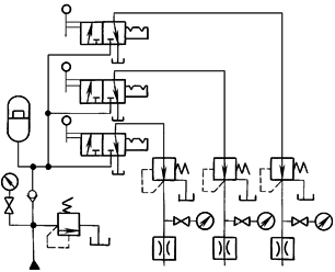本回路采用多个减压阀并联组成减压回路。泵供油压力最高,在高压油路上依次并联减压阀,根据需要分别获得多路减压支路,各支路互不干扰。采用蓄能器后,只需采用小流量的泵即可 |