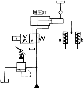 本回路用增压液压缸进行增压,工作液压缸a、b靠弹簧力返回,充油装置用来补充高压回路漏损。在气液并用的系统中可用气液增压器,以压缩空气为动力获得高压 |