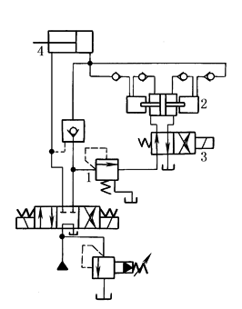 本回路利用双作用增压器实现双向增压,保证连续输出高压油。当液压缸4活塞左行遇到较大载荷时,系统压力升高,油经顺序阀1进入双作用增压器2,无论增压器左行或右行,均能输出高压油液至液压缸4右腔,只要换向阀3不断切换,就能使增压器2不断地往复运动,使液压缸4活塞左行较长的行程连续输出高压油 |