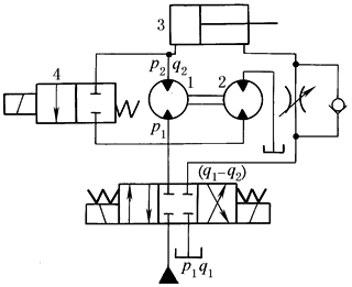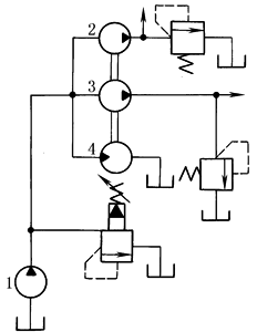 本回路多用于起重机的液压系统。液压泵2和3由液压马达4驱动,泵l与泵2或泵3串联,从而实现增压 |