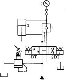 采用液控单向阀1和电接点式压力表2实现自动补油的保压回路。电接点式压力表控制压力变化范围。当压力上升到调定压力时,上触点接通,换向阀1DT断电,泵卸荷,液压缸3由单向阀1保压。当压力下降到下触点调定压力时,1DT通电,泵开始供油,使压力上升,直到上触点调定值。为了防止电接点压力表冲坏,应装有缓冲装置。本回路适用于保压时间长、压力稳定性要求不高的场合 |