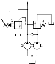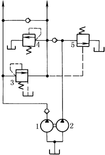 本回路为机械中常用的辅助泵保压回路。当系统压力较低时,低压大泵1和高压小泵2同时供油;当系统压力升高到卸荷阀4的调定压力时,泵1卸荷,泵2供油保持溢流阀3调定值。由于保压状态下液压缸只需微量位移,仅用小泵供给,便可减少系统发热,节省能耗 |