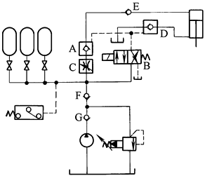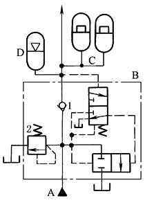 液压泵卸荷时,蓄能器作为能源使液压系统实现保压。液压泵A输出的油液流入卸荷腔,同时经单向阀进入液压系统。液压泵的最高压力由溢流阀2控制。液压泵在卸荷期间,由蓄能器C来补偿泄漏,保持系统压力。当系统压力下降到一定值时,液压泵在卸荷阀作用下,重新经单向阀1向系统供油,直至达到给定压力为止。为了降低自动卸荷阀B及泵的动载荷,并减少系统中压力波动,在泵与自动卸荷阀B之间装一小容量气液蓄能器D |