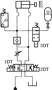 压紧工件动作:换向阀1DT通电,液压缸压紧工件,同时向蓄能器充压,达到一定压力后,1DT断电,液控单向阀和蓄能器共同作用,保持液压缸的压紧力 放松工件动作:换向阀2DT通电,同时3DT通电,液控单向阀打开,液压缸缩回,蓄能器回路切断保持压力 本回路保压时间长、压力稳定、压力保持可靠 |