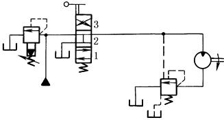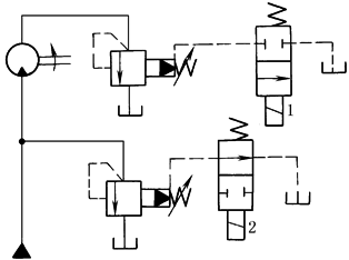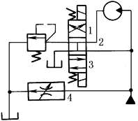 本回路适用于液压马达产生负载荷时的工况。四通阀切换到1位置,当液压马达为正载荷时,顺序阀由于压力油作用而被打开;但当液压马达为负载荷时,液压马达入口侧的油压降低,顺序阀起制动作用。如四通阀处于2位置,液压马达停止 |
