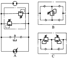 采用制动组件A、B或C组成的制动回路,在执行元件正、反转时都能实现制动作用 当主油路压力超过溢流阀调定压力时,溢流阀被打开,在液压系统中起安全阀作用。减速时变量泵的排油量减至最小,但由于载荷的惯性作用使马达转为泵的工况,出口产生高压,此时溢流阀起缓冲和制动作用 回路中a点接油箱,通过单向阀从油箱补油。对于无自吸能力的液压马达,应在a点通油箱的油路上串接一个背压阀,或通过辅助油泵进行补油,从而避免液压马达产生吸空现象 制动组件用于开式回路时,组件内溢流阀调定压力,要比限制液压泵输出压力的溢流阀的调定值高0.5~1MPa左右 |