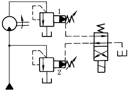 本回路为用液控溢流阀的制动回路。以两个电磁阀分别操纵两个溢流阀的遥控口,电磁阀1用于减速或制动,电磁阀2用于加速或液压泵卸荷 |