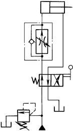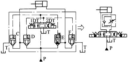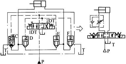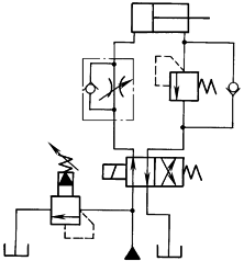 本回路是用二通插装阀装在进油路上的节流调速回路。在插装阀内装有挡块,限制阀芯的行程,以形成节流口。调节插装阀E的挡块位置可以实现调节活塞移动速度。本回路适用于大流量液压系统 |