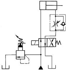本回路将调速阀装在进油回路中,适用于以正载荷操作的液压缸。液压泵的余油经过溢流阀排出,液压泵以溢流阀设定压力工作。这种回路效率低,油液易发热,但调速范围大,适用于轻载低速工况。应用调速阀比节流阀调速稳定性好,因此,在对速度稳定性要求较高的场合一般选用调速阀 |