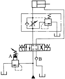 本回路采用单向节流阀和溢控溢流阀在回油路调速。活塞向右移动,当载荷较小时,液压缸右腔的压力较大,阀B开口量增大;液压缸左腔压力减小,并与载荷相适应。当载荷增大时,液压缸右腔的压力减小,阀B开口量减小,液压缸左腔压力随着增大,并与载荷相适应。在该回路中,泵的压力随着载荷而变化,效率较高,载荷特性好 |
