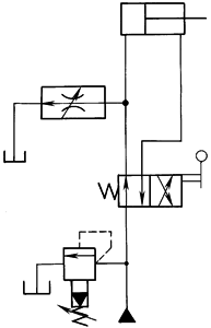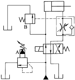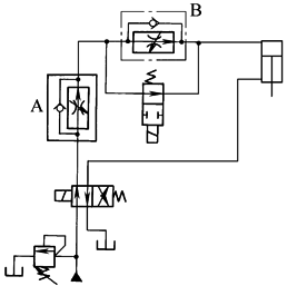 本回路是将两个调速阀串联配置,实现液压缸的运动在两种速度之间切换。图示状态液压缸以调速阀A调定的速度运行;当二位二通阀换向后,液压缸以调速阀B调定的速度运行。该回路中,调速阀A的调定流量应大于调速阀B的调定流量 |