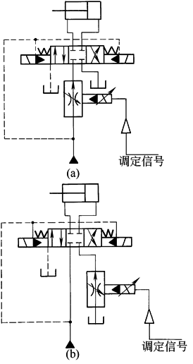 图a所示回路是用比例流量阀装在进油路上的调速回路。本回路适用于复杂的流量控制,使回路简化,并避免速度换接时的冲击 图b所示回路是将比例流量阀装在回油路上的调速回路,特点与图a相同。用比例流量阀调速连续性自动化控制容易,一般称为自动调速回路 |