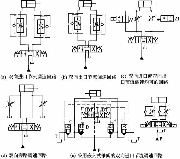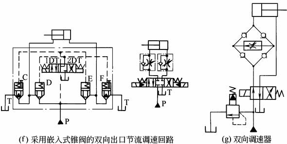 图a~图f所示的各回路为执行元件往返速度都可以调节的回路。调节节流阀或调速阀,可满足执行元件往返速度的要求 图e、图f所示的调速回路适用于大流量液压系统 图g所示为用一个调速回路和四个单向阀组成的调速器实现双向节流调速。四个单向阀的作用是保证油液均能沿同一方向流经调速阀,保证调速阀中的定差减压阀起压力补偿作用。由于调速阀对同一个油腔进行节流,因此,即使是单杆式的液压缸,也能实现活塞的往返速度相等 |