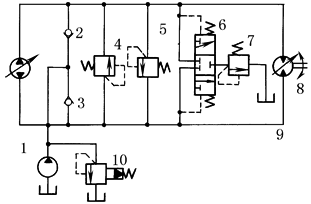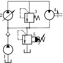 本回路是由单向变量泵和单向定量马达组成的容积调速回路。改变变量泵2的流量,可以调节液压马达4的转速。在高压管路上装有安全阀3,防止回路过载。在低压管路上装有一小容量的补油泵1,用以补充变量泵和定量马达的泄漏,泵的流量一般为主泵2的20%~30%,补油泵向变量泵供油,以改变变量泵的特性和防止空气渗入管路。泵1工作压力由溢流阀5调整。本回路为闭式油路,结构紧凑 |