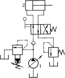 本回路为变量泵-液压缸组成的容积调速回路。改变变量泵1的流量,可调节液压缸2的运动速度。变量泵1的输出流量与液压缸的载荷流量相协调。根据液压缸运动速度的要求,调节变量泵的变量机构实现液压缸运行工况 |