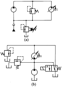 本回路为定量泵-变量马达组成的容积调速回路。图a所示为闭式油路,图b所示为开式油路 泵出口为定压力、定流量,当调节变量马达时,其排量增大,转矩成正比增大而转速成正比减小,功率输出为恒值。因此,这类回路又称为恒功率回路。该回路适用于卷扬机、起重运输机械上,可使原动机保持在恒功率的高效率点工作,从而能最大限度地利用原动机的功率,达到节省能源的目的 闭式调速回路,需一个小型液压泵作为补油泵,以补充主油泵和马达的泄漏 |
