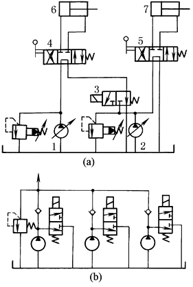 图a所示回路采用换向阀改变泵组连接,实现有级调速。泵1、2分别通过阀4、5向缸6、7供油,此时为低速状态;若阀3的电磁铁通电,阀4处于中位,则泵1、2合流,共同向液压缸7供油,此时为高速工况 图b所示为由三个泵构成的调速回路。改变各换向阀的通断电状态,即可达到调速的目的。各泵出口的单向阀防止三泵之间干扰 |