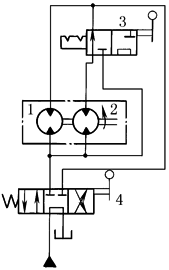 本回路为改变马达组连接的调速回路。当换向阀4处于左位,两马达并联,低速旋转,转矩大;阀3处于右位时,马达2自成回路,马达组高速旋转,转矩小 |