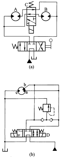 图a中,A、B各表示有独立进出油道的双排柱塞马达中的一排。阀C处图示位置时,两排柱塞并联,马达低速旋转;当阀C通电时两排柱塞串联,马达转速加倍,但输出转矩减半。若A、B是两个马达,则同理实现调速 图b所示为改变马达有效作用次数调速。a、b、c为三组配油口。当阀D处左位时,a、b同时进油,c组回油,马达全排量,故转速较低;当阀D处右位时,c、b两组回油,故作用次数减半,从而排量减半,马达转速提高一倍,输出转矩也减半 |