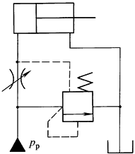 液压泵的工作压力pp能随外载荷而变化,即pp能与外载荷相适应,使原动机的功率能随外载荷的减小而减小。回路中采用定差溢流阀,它能使节流阀前后的压差保持常数(Δp=0.2~0.7MPa)。此类调速回路的效率一般比节流调速回路效率提高10%左右 |