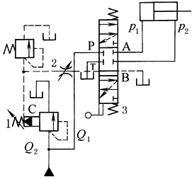 本回路采用机动比例方向阀3,当处中位时,定差溢流阀1的C口与油箱相通,液压泵卸荷。当阀3换向,阀1控制管路随之换向,与阀1流出侧管路相通,C口与阀3工作油口(A或B)相通。此时,阀1的阀芯就成为带有节流功能的比例方向阀的压力补偿阀,使比例方向阀工作油口压差为一定值。通过该阀的流量Q1仅与阀口开度成比例,而与载荷压力变化无关 由于载荷压力反馈作用,液压泵的压力自动与载荷压力相适应,始终保持比载荷压力高一恒定值,实现压力适应状态。节流阀2起载荷压力反馈阻尼作用,使液压泵随载荷压力变化的速率不至于过快 |