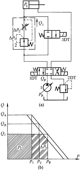 本回路为由限压式变量叶片泵1和调速阀2组成的流量适应回路。当泵的工作压力pp小于p1时,令电磁阀1DT、3DT通电,液压缸快进,快进速度由泵的流量调节到最大流量Qa决定。同样,当2DT、3DT通电时,液压缸快退 通过调节阀2中的节流阀,再调节泵的调压螺钉,可调节工作推进状态。随着泵的工作压力升高,偏心距自动减小,流量减小,直至与Q1相等为止,即称之为流量适应,系统效益较高 由图b可知,该系统有用功率为P2,经阀2的节流损失为ΔP2,若调压螺钉拧得太紧,会使节流损失ΔP2增大,这是不利的 本回路不适于外载荷变化较大,且经常在轻载下工作的系统。此时,应改用功率适应回路 |