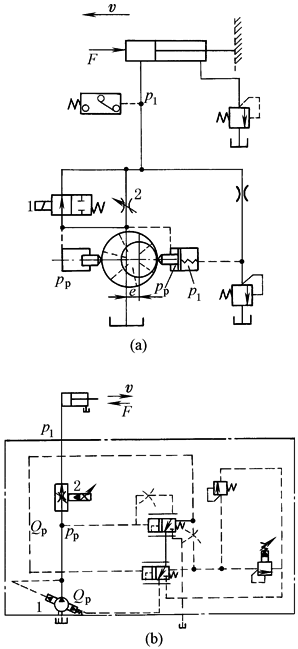 本回路为由压差式变量泵(叶片泵或柱塞泵)与节流阀(安装位置可在进油路上或回油路上)组成的功率适应回路 图a所示位置时,泵排出油不经节流阀2而经阀1左位进液压缸左腔,此时,控制泵定子与转子偏心距的两个液压缸油压相等,液压泵的定子在弹簧力的作用下,处于最左位置,定子与转子之间偏心距e最大,泵的流量也最大,液压缸处于快速工作状态。当阀1处右位时,泵排油经节流阀2进入油缸。由于压力损失,所以pp>p1,压缩弹簧,定子右移,偏心距变小,泵流量减小,液压缸处于慢速运行。为了可靠地控制转子与定子间距离,节流阀进、出口压差一般为0.3~0.4MPa 本回路在泵的出口压力pp随外载荷变化而变化,属于功率适应回路,其效率高于流量适应回路,也高于压力适应回路。例如,图b所示为由载荷敏感泵组成的功率适应系统,采用F型控制装置(除泵1、阀2的其余部分)通过节流阀2压差控制泵的排量,实现功率适应控制。该系统的效率高达85% |