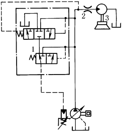 本回路为功率适应回路应用实例。件3为清扫道路尘埃旋转刷,由液压马达带动。为了保证驱动液压泵原动机转速发生变化时,液压泵输出给马达的流量不变,实现旋转刷转速不变的目的,在回路中设置一个功率适应阀1,用来保证固定节流孔2前后压差一定 |