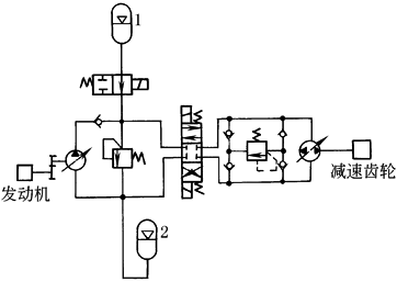 本回路为用蓄能器在行走机械闭式传动系统中实现节能的回路。高压蓄能器1装在回路的高压侧,用于蓄能。低压蓄能器2装在液压泵入口,用于补油,并保证油路具有一定背压。当车辆启动时,蓄能器储存的能量与发动机带动泵输出的能量共同使车辆加速;在正常运行载荷阻力增大时,蓄能器供给能量,反之储存能量;在车辆减速制动时减小液压泵摆角并将液压马达的摆角通过零点向其反向调节,液压马达在惯性带动下呈现泵工况运转,将制动能量回馈到高压侧由蓄能器蓄能,在需要的时候又能输出,使发动机在高效区工作,因此节省能量 |