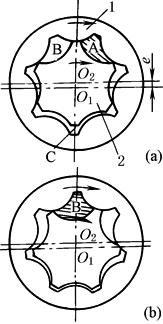具有摆线共轭齿形的外转子1和内转子2之间有偏心矩e,内转子绕中心O1顺时针转动时,带动外转子绕中心O2同向旋转,此时B容腔逐渐增大形成真空,与其相通的配油盘槽进油,形成吸油过程。当内、外转子转至图b位置时,B容腔为最大,而A容腔随转子转动逐渐缩小,同时与配油盘出油口相通,形成排油过程。当A容腔转到图a中C处时,封闭容积最小,压油过程结束。继而又是吸油过程。这样,内、外转子异速同向绕各自中心O1、O2转动,使内、外转子所围成的容腔不断发生容积变化,形成吸、排油过程 |