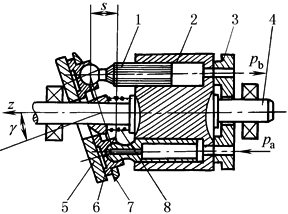 1—柱塞; 2—缸体; 3—配油盘; 4—传动轴; 5—斜盘; 6—滑靴; 7—同程盘; 8—中心弹簧 |