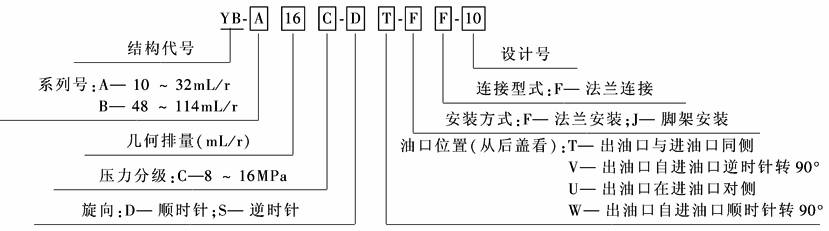 YB型车辆用泵内部零件用螺钉装配成一个组合体,使得装配与维修更加容易。泵内装有一个浮动式配流盘,可自动补偿轴向间隙。关键零件选用优质合金钢并经氮化处理,可进一步提高零件加工精度,因此,压力、效率较一般叶片泵为高。该型泵结构紧凑,压力流量脉动少,对冲击载荷的适应性好,安装连接符合ISO标准,可广泛用于起重运输车辆、工程机械及其他行走式机械,也可用于一般工业设备的液压系统 型号意义: