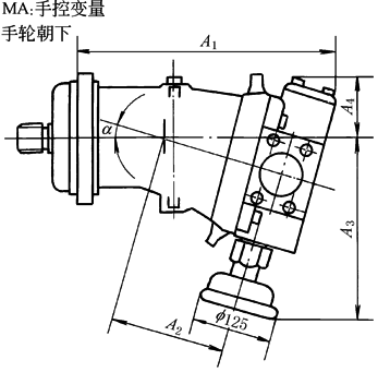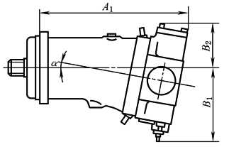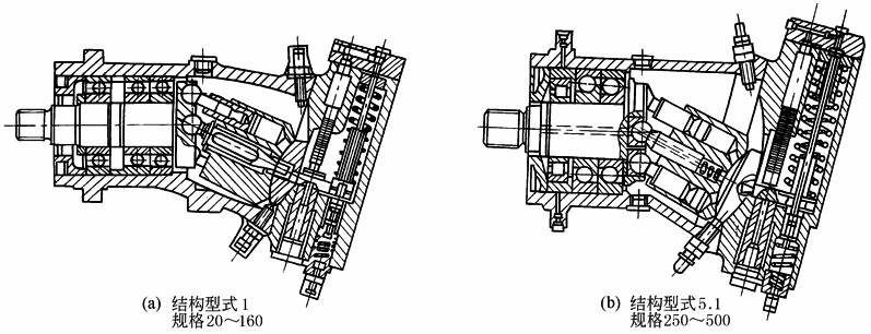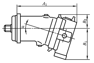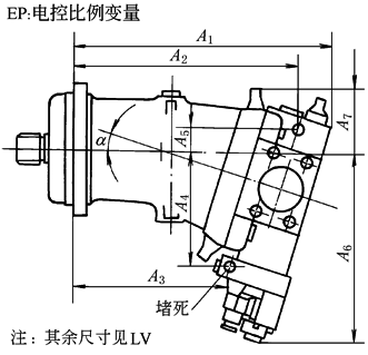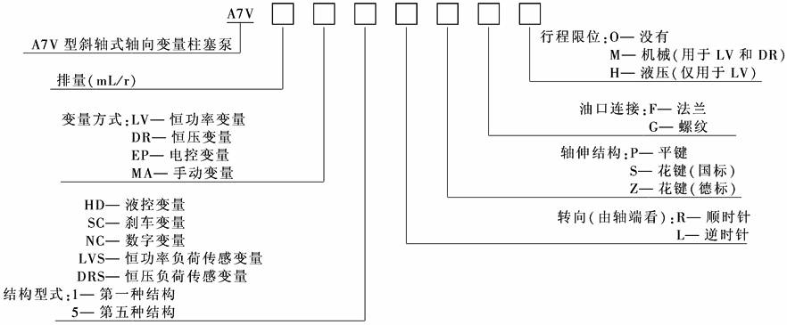 A※V斜轴式轴向柱塞泵(马达)的结构特点为:采用大压力角向心推力串联轴承组,主轴与缸体间通过连杆柱塞副中的连杆传递运动,采用双金属缸体,中心轴和球面配油盘使缸体自行定心,拨销带动配油盘在后盖弧形轨道上滑动改变缸体摆角实现变量。它与斜盘式轴向柱塞泵相比,具有柱塞侧向力小、缸体摆角较大、配油盘分布圆直径小、转速高、自吸能力强、耐冲击性能好、效率高、易于实现多种变量方式等优点 (1) A7V型斜轴式轴向变量柱塞泵 型号意义: