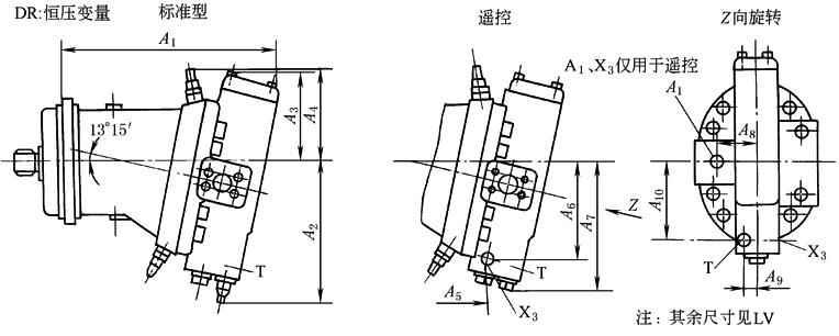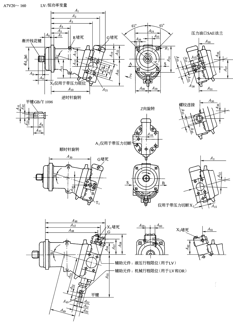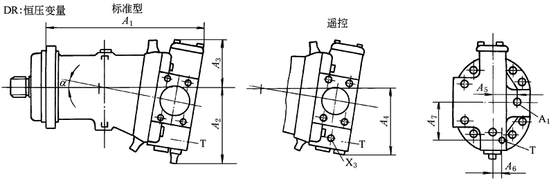 注:1.A,B—工作油口;S—吸油口;G—遥控压力口(总功率控制口);X1—先导压力口;X2—遥控压力口;A1,X3—遥控阀油口;T,T1—先导油回油口;R—排气口;U—冲洗口。 2.生产厂:北京华德液压泵分公司,贵阳航空液压件厂 |