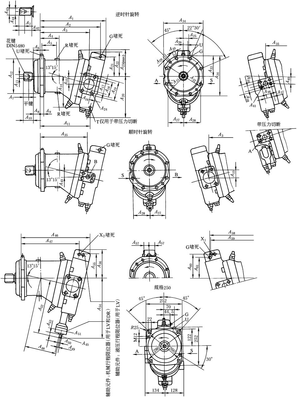 A,B—工作油口;S—吸油口;G—遥控压力口;(总功率控制口);X1—先导压力口;X2—遥控压力口;A1,X3—遥控阀油口;T,T1—先导油回油口;R—排气口;U—冲洗口 |