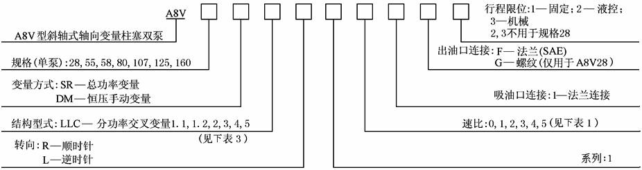 A8V型斜轴式轴向变量柱塞双泵由两个排量相同的轴向柱塞泵、减速齿轮、总功率调节器组成。两个泵装在一个壳体内通过同一驱动轴传动。总功率控制器是一个压力先导控制装置,该装置随外载荷的改变而连续地改变两个连在一起的泵的摆角和相应的行程容积。摆角α在7°~25°之间变动。当外载荷增大时系统压力也增加,这时摆角变小,流量也减小,因而使泵输出的功率在一定转速下保持恒定 A8V型斜轴式轴向变量柱塞双泵具有压力高、体积小、重量轻、寿命长、易于保养等特点,适用于工程机械及其他机械上,如应用在挖掘机、推土机等双泵变量开式液压系统中 型号意义: